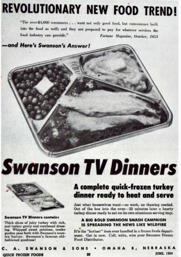 We can thank Thanksgiving for the invention of the iconic TV Dinner. In 1953, the Swanson company grossly overestimated how many turkeys consumers would buy and ended up with 260 tons of extra turkey! Inspired by the meal trays served on airliners, a Swanson employee came up with the ingenious idea of creating and selling individually frozen turkey dinners complete with cornbread stuffing, gravy, peas, and sweet potatoes on reheatable trays. This idea was a big hit and was the beginning of the prosperous TV Dinner industry.