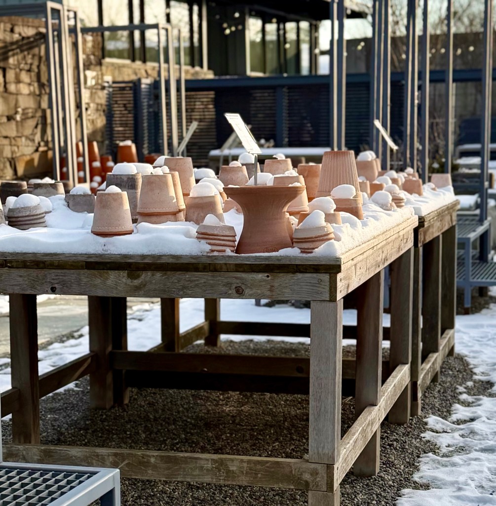 snowy caps—patiently waiting in winter stasis for spring to come, when they can be filled with warm soil and plants once again.