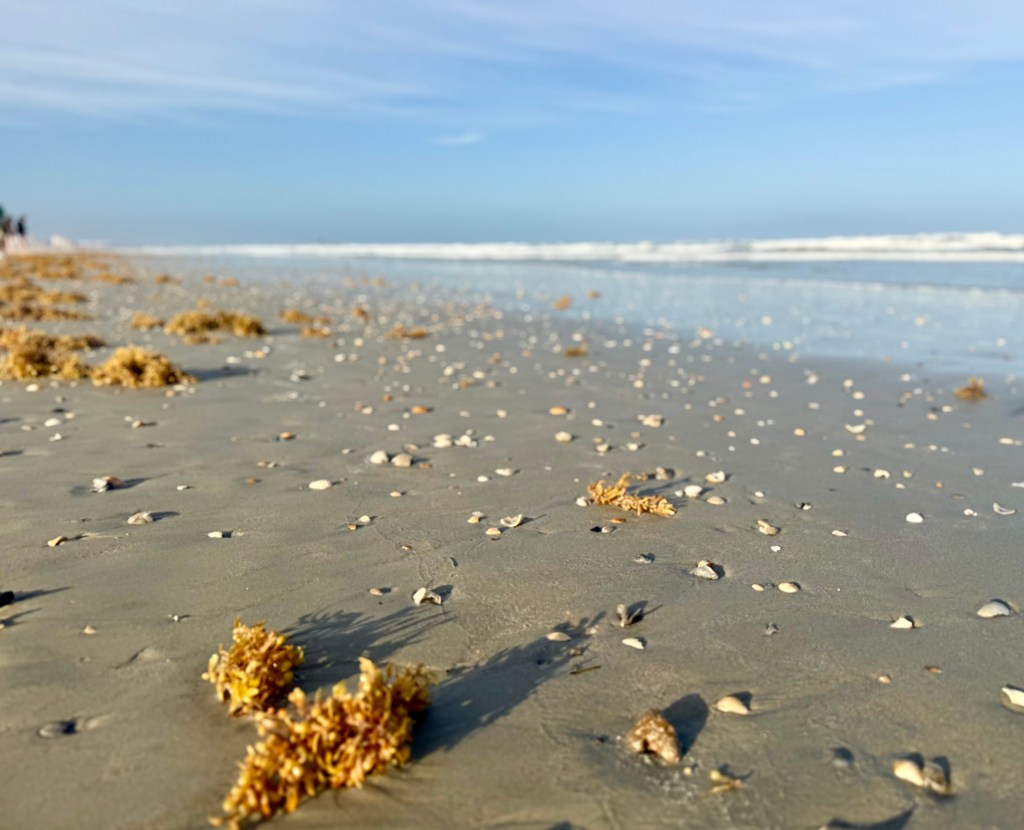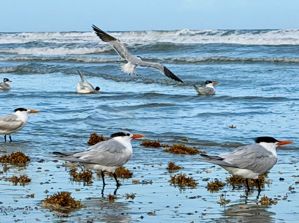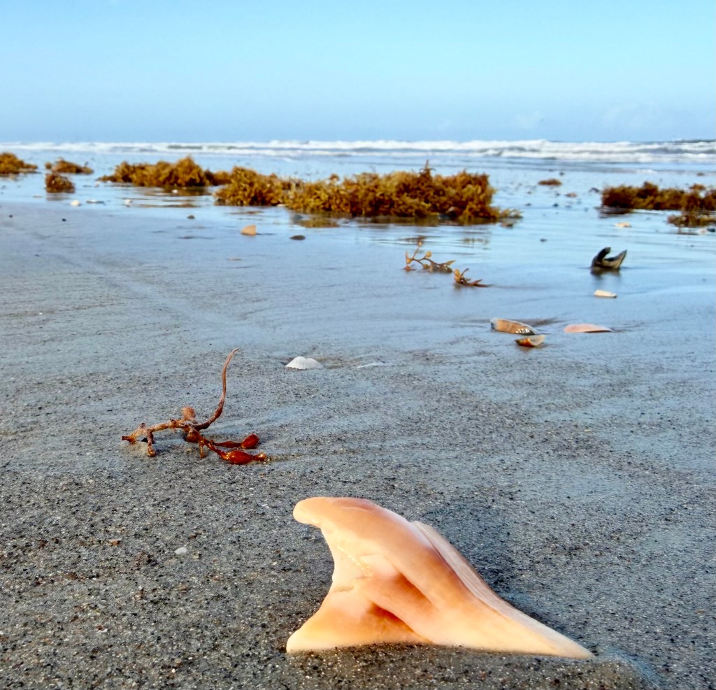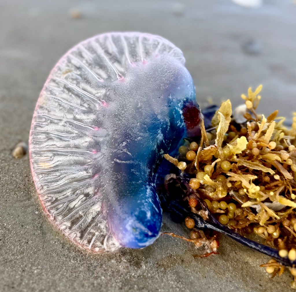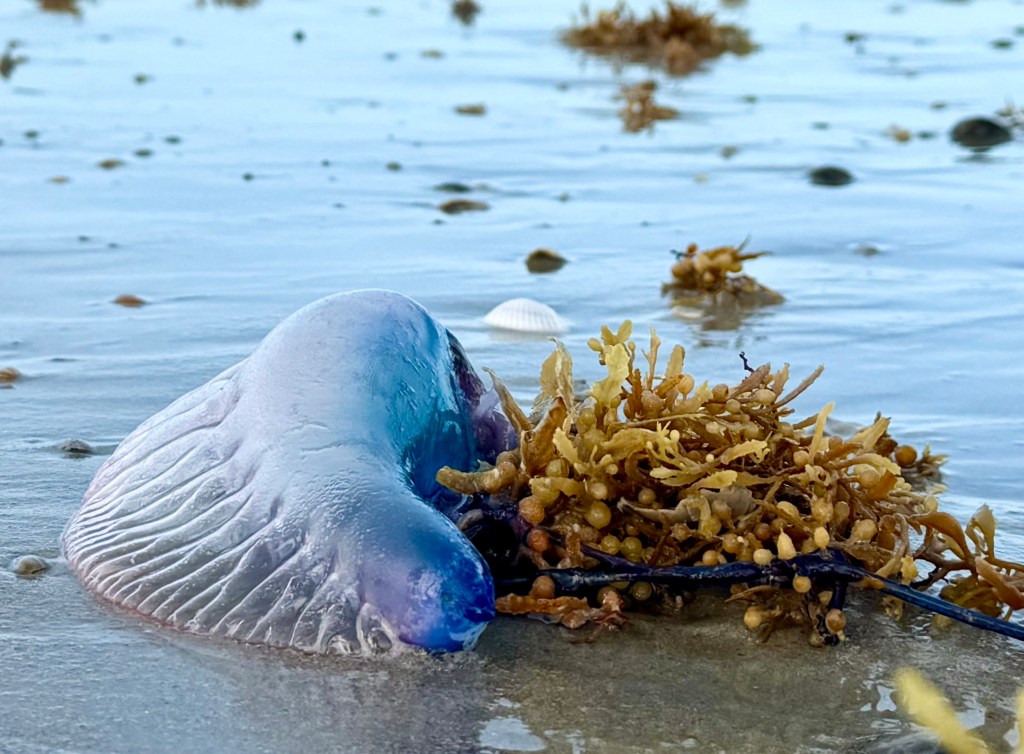 Luke and I wandered the shoreline watching Royal Terns and listening to the rush of water as the waves rolled in. We searched for seashells and stumbled upon — almost literally — several Portuguese man-o’-war washed up by the tide.