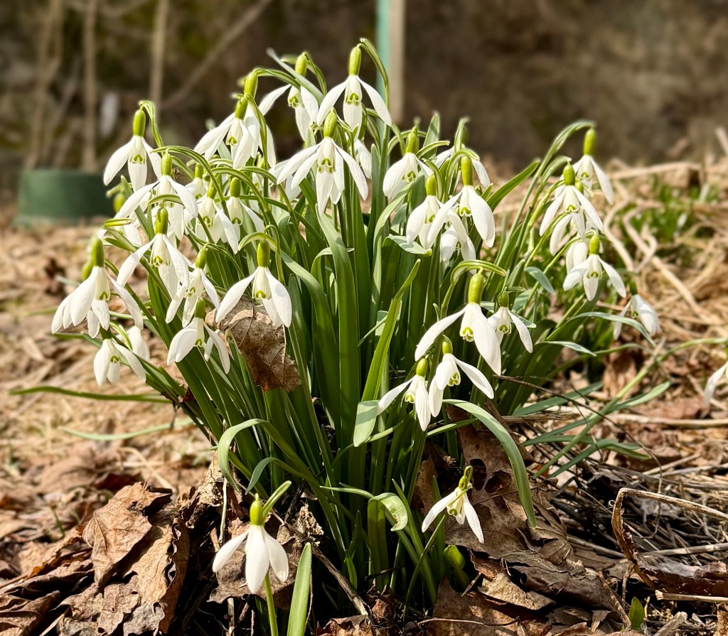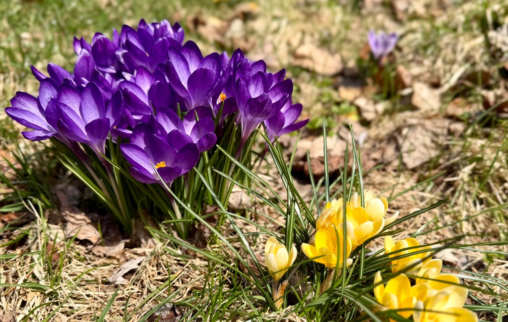 The month began with huge piles of snow in my yard, but the snow has now completely melted away, and we can see tangible signs of spring such as brighter, warmer sun, snow crocuses and snowdrops pushing through the soft, damp earth, patches of bright green moss blooming in sidewalk cracks and rocky crevices, and the return of robins—bouncing around looking for worms.